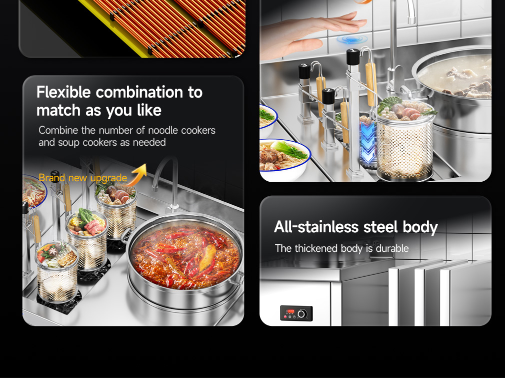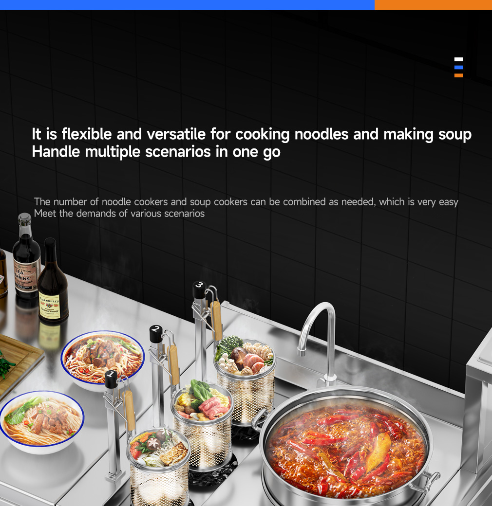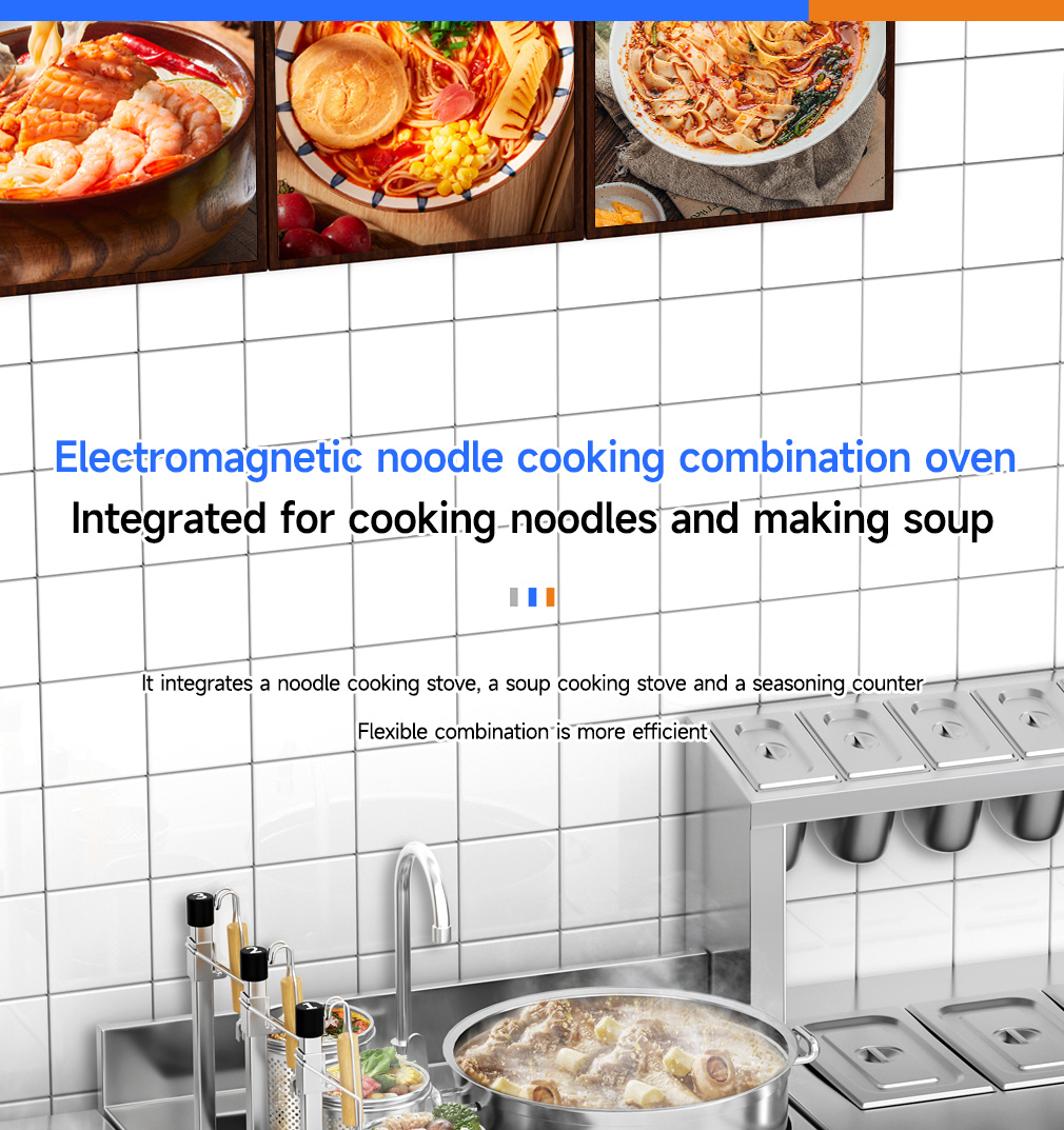 3-head noodle cooking stove + single-head soup stove with a diameter of 40CM + 3-tone seasoning table